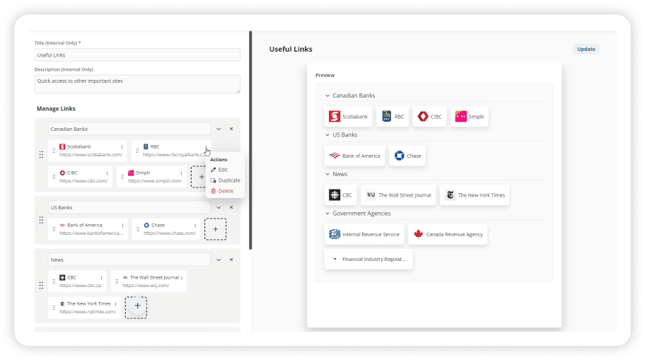 - Drag-and-Drop: Easily reorganize links with a simple drag-and-drop.
